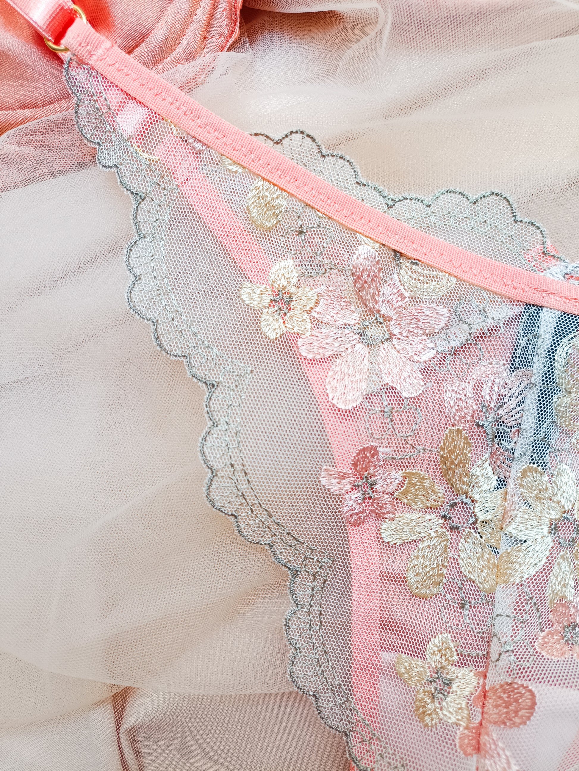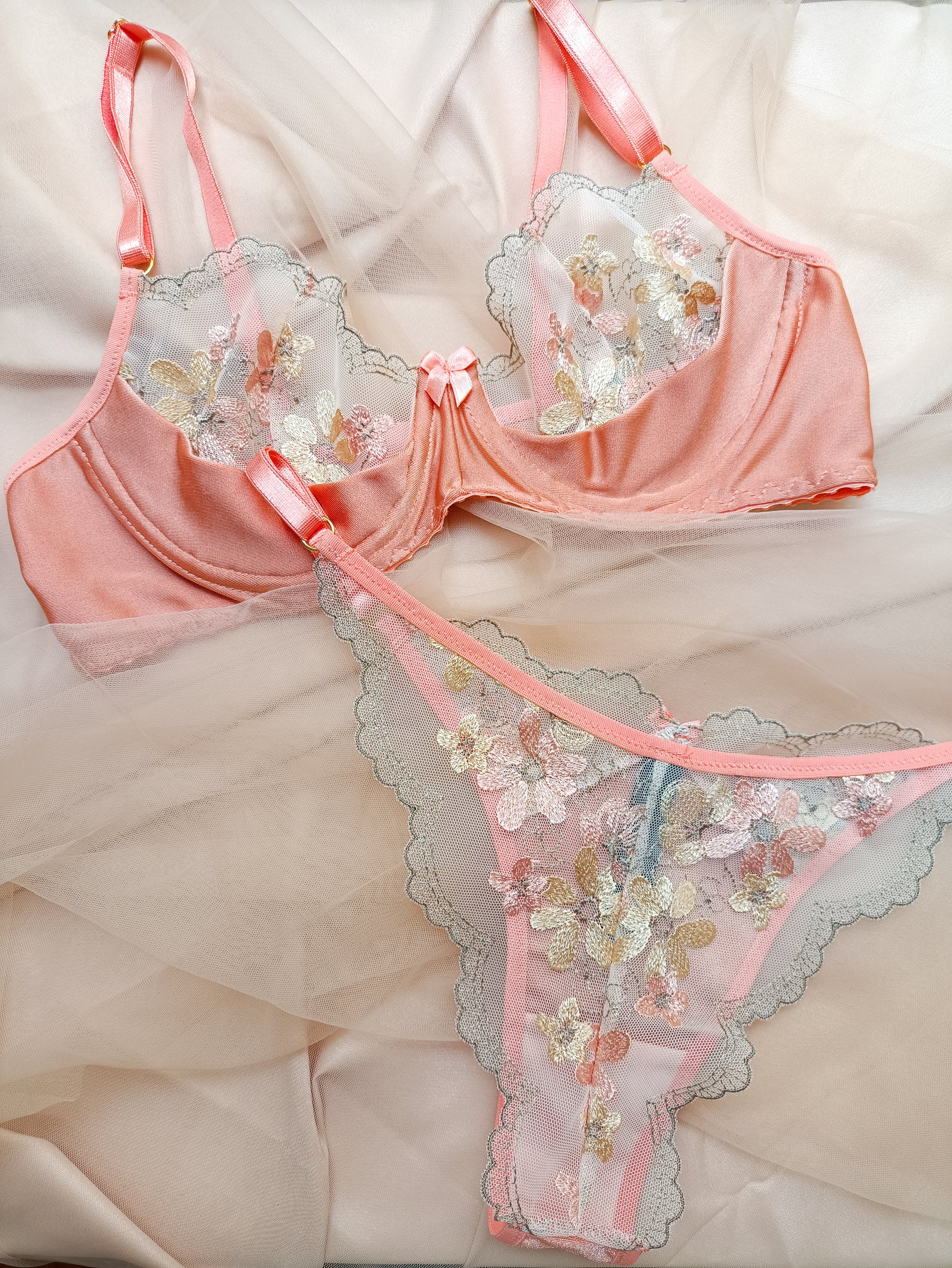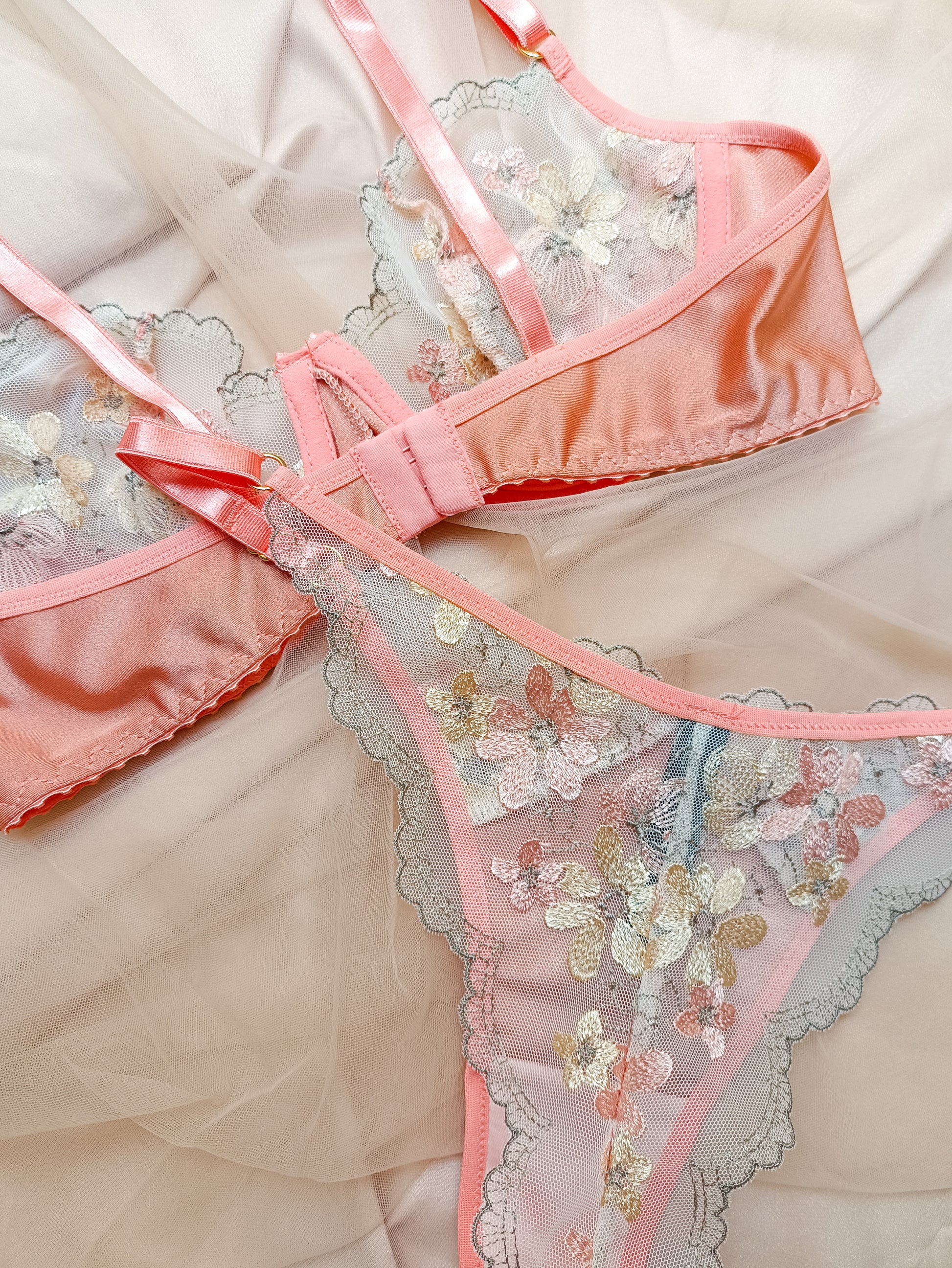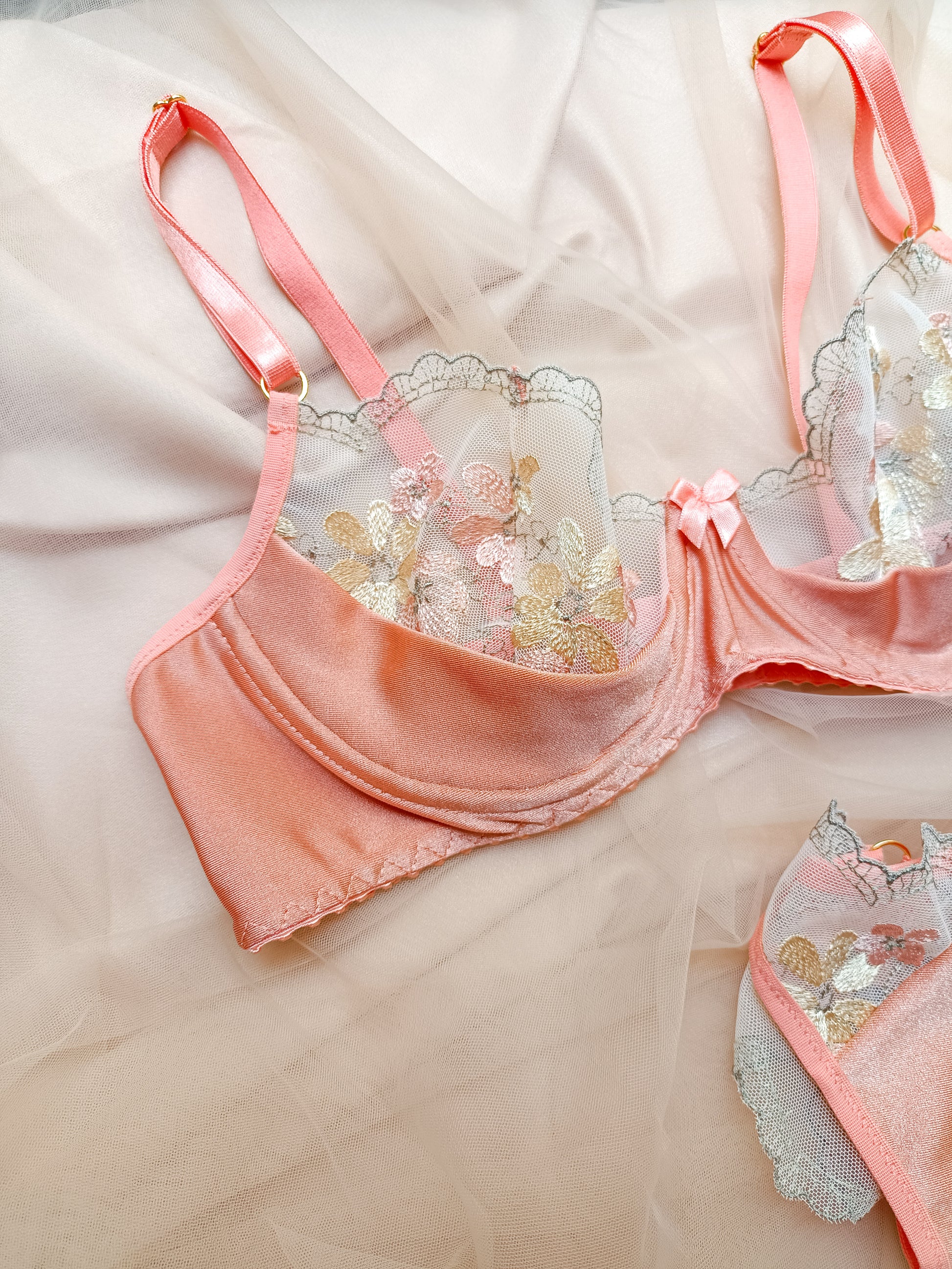 Inspirado en la calidez de los días que florecen, Coralia envuelve la piel con su tono melón y su delicado bordado floral. Cada detalle refleja la suavidad y la dulzura natural de la primavera. Más que una prenda, es un suspiro de luz sobre la piel: cálido, romántico y lleno de vida.
